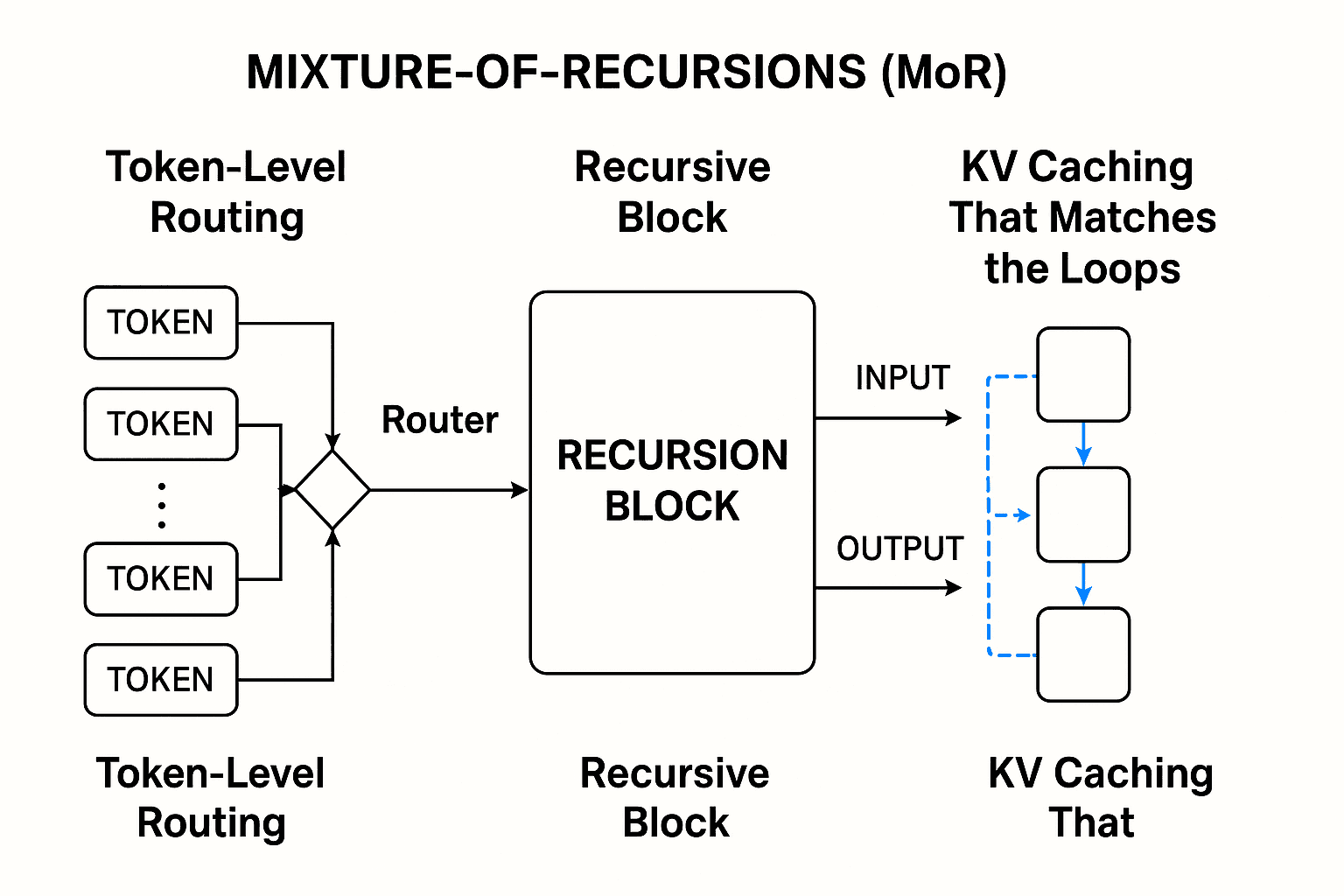 This captures the main mechanics described in the paper: a shared block, router-based token selection per depth, and two KV-cache options tuned for dynamic recursion. Implementation details (e.g., load-balancing losses and “Middle-Cycle” parameter sharing) are in the paper.